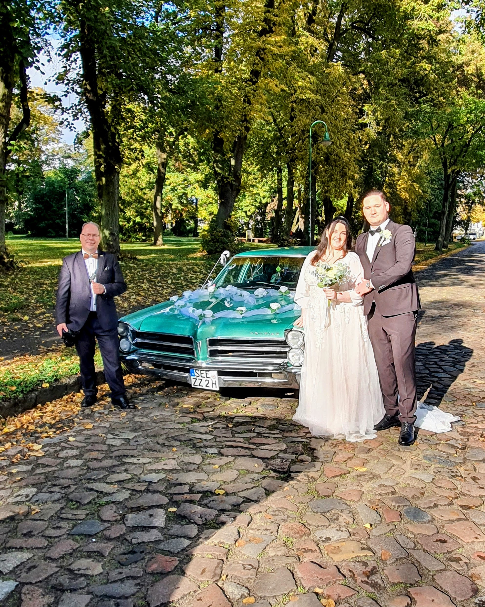 Beim anschließenden Brautpaarshooting im Park leuchteten Sonne, Blätter und das Lächeln der beiden um die Wette. Zwischen altem Kopfsteinpflaster, dem eleganten Oldtimer und dem goldenen Licht des Nachmittags entstanden wunderbare Aufnahmen, die den Tag perfekt widerspiegeln. 📸